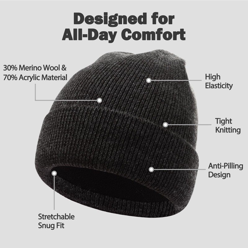 - 【Premium Materials】- Beanie hats for men and women are made of 30% Wool (Merino) and 70% Acrylic. Middle: 100% Waterproof Membrane; Inner: 100% Polyester Fleece. Machine wash at max. 30°C 86 °F. Do not tumble dry.