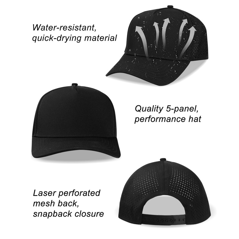 - PERFORMANCE SNAPBACK HAT: 5 panel adjustable snapback baseball cap made with 100% polyester, laser-perforated side & rear panels for breathability, and soft touch snapback closure. Curved brim keep the sun from your face and offers great protection