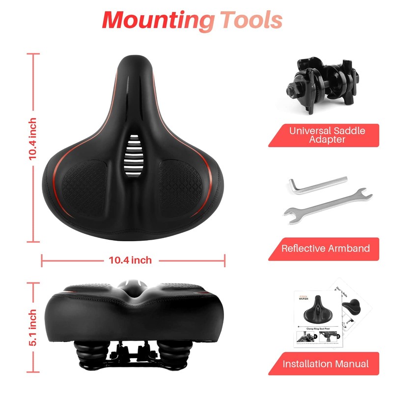 - 【Oversized and Comfortable Bike Seat】The oversized breathable seat is in close contact with your buttocks and legs, Rejecting the harm caused by the rigid and narrow original seat cushion. This bicycle saddle is made with high density foam and elastomer spring suspension, So that you can enjoy a better spin bike course.