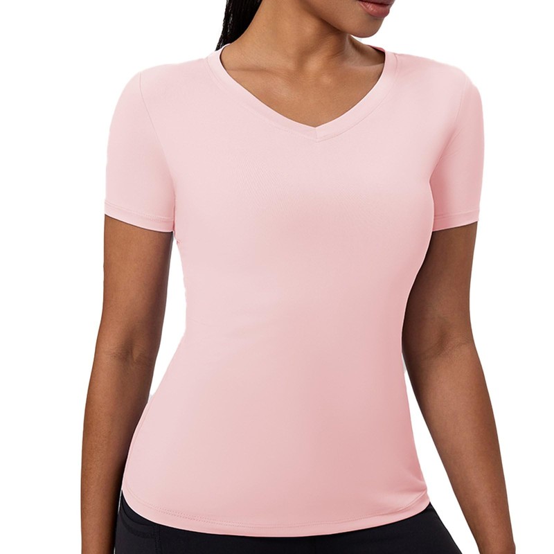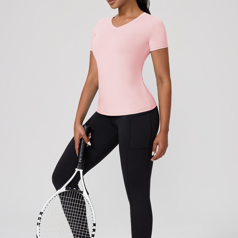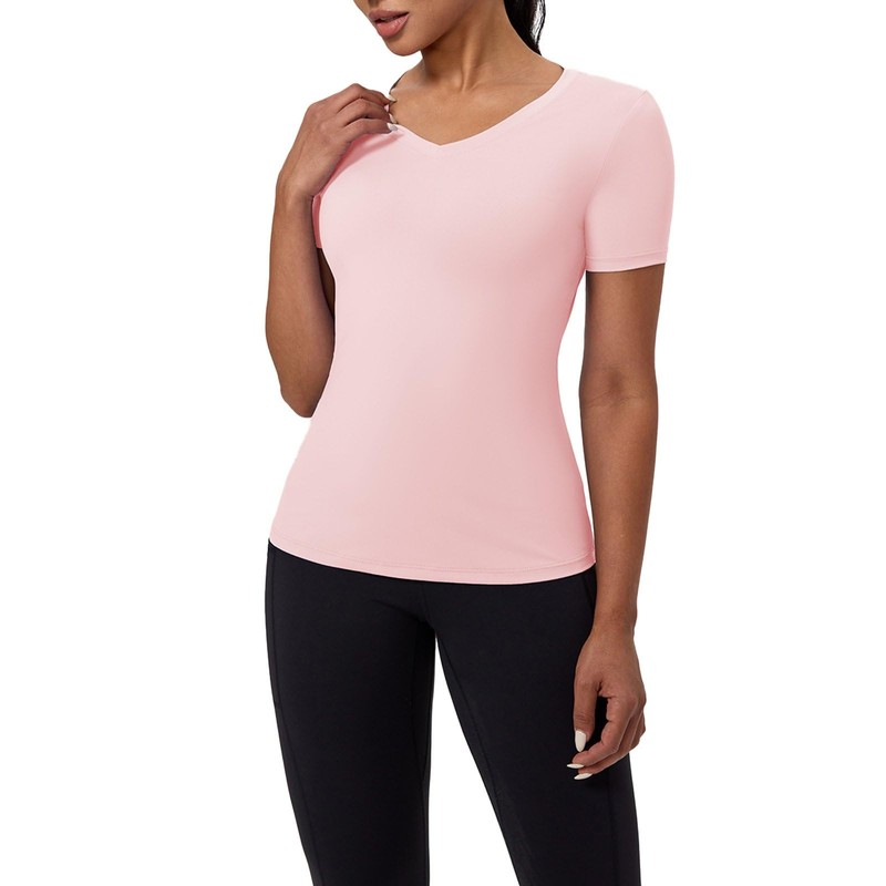 OVIYEGAIN Pink V-Neck Compression T Shirts for Women,Basic Casual Yoga T-Shirts,Quick Dry Athletic Running Tops