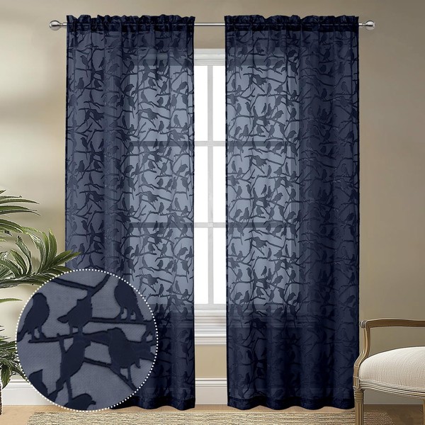 OVZME Anji Textured Navy Blue Sheer Curtains 84 inch Length 2 Panels Set for Living Room, Semi Voile Privacy & Light Filtering Elegant Jacquard Sheer Curtain for Bedroom, Dual Rod Pocket, 38Wx84L