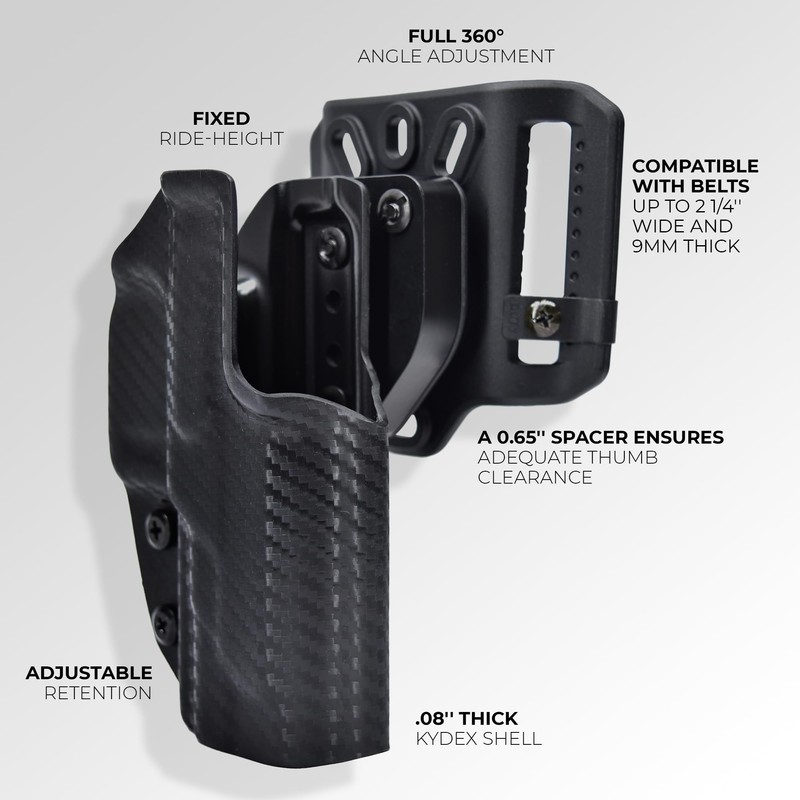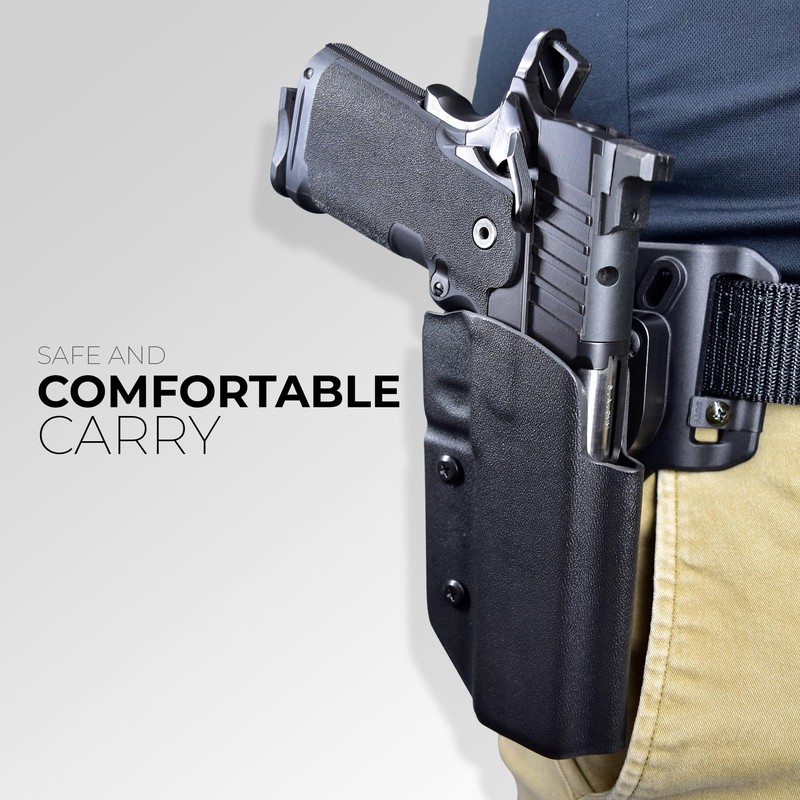 - Optimized competition cut for lightning-fast draws, compatible with slide-mounted optics and aftermarket raised sights.