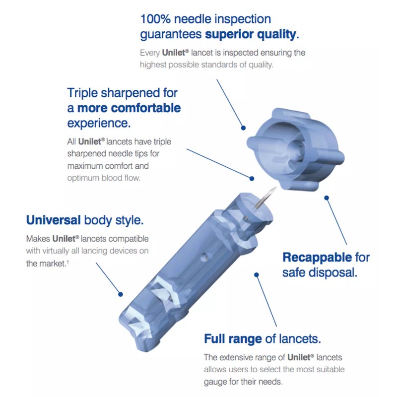 Unilet lancets are sterile, single-use lancets designed for at-home capillary blood sampling. These lancets are precision sharpened to deliver maximum comfort and optimal blood flow. Also available in Unilet ComforTouch™ lancets, with re-cappable feature.