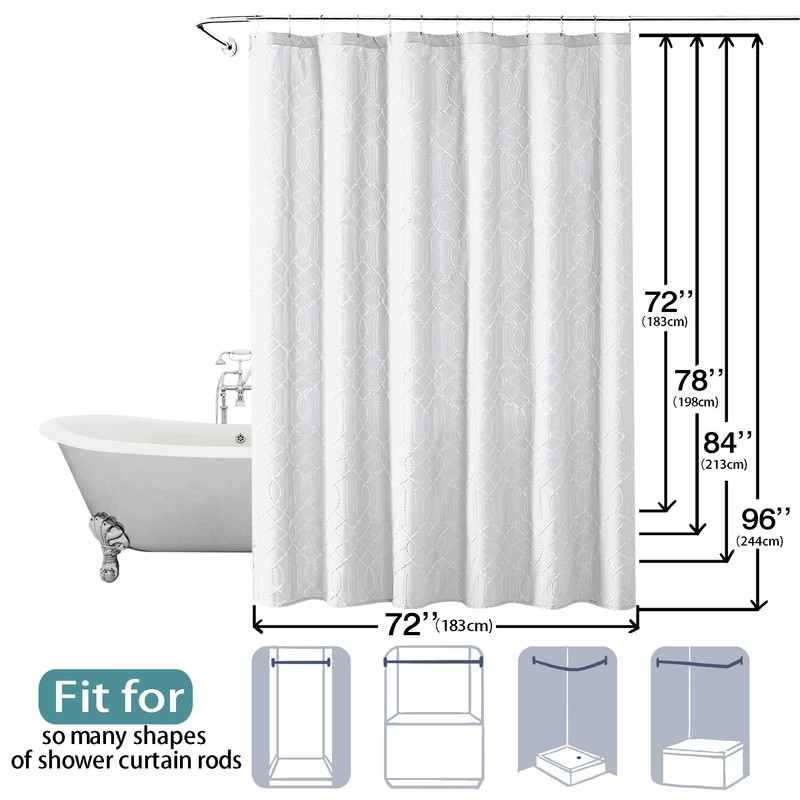 - 【STYLING DESIPGN】The white Farmhouse shower curtain is textured elegant looking and adds a special brightness to bathroom. 3D Embossed luxury geometric motif pattern on the fabric is also very eye pleasing, which can deliver a hotel-like bathroom environment. Suitable for master bathroom, guest bathroom, kid's bathroom.