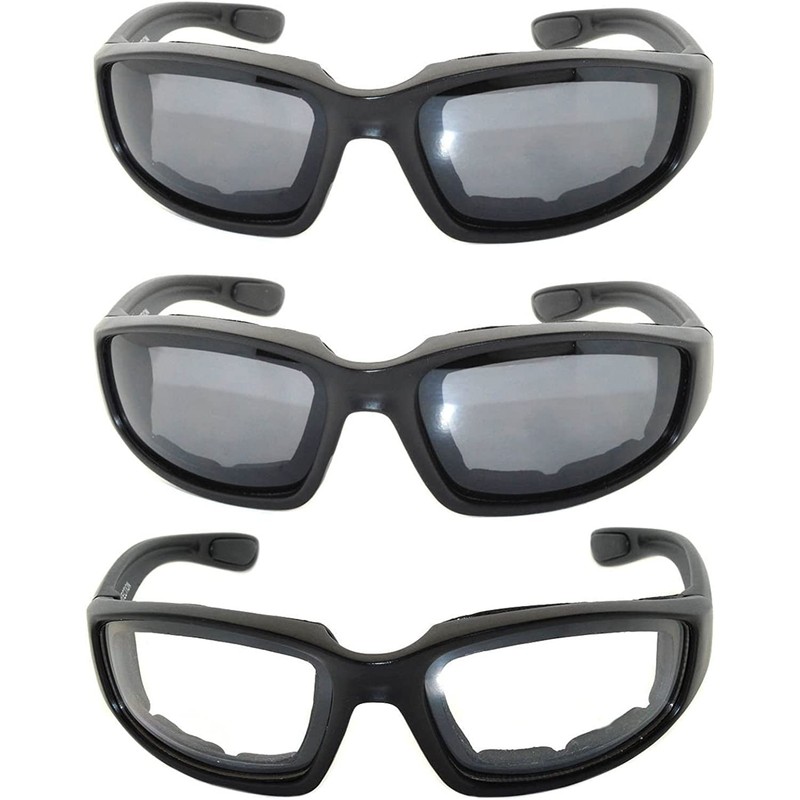 OWL Motorcycle Padded Riding Glasses Clear and Smoke Lens Mens Womens 3 Pack Sunglasses