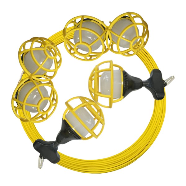- [Heavy-duty & Daisy-chained Design]: The construction string lights with cages are built to withstand the rigor conditions on construction sites. This construction rope lights is IP65 waterproof, making them suitable for outdoor use. You can connect up to 3 sets of 50ft construction string lights, producing an impressive total of 24,000 Lumens through end-to-end connections, which can be extended to cover larger areas.