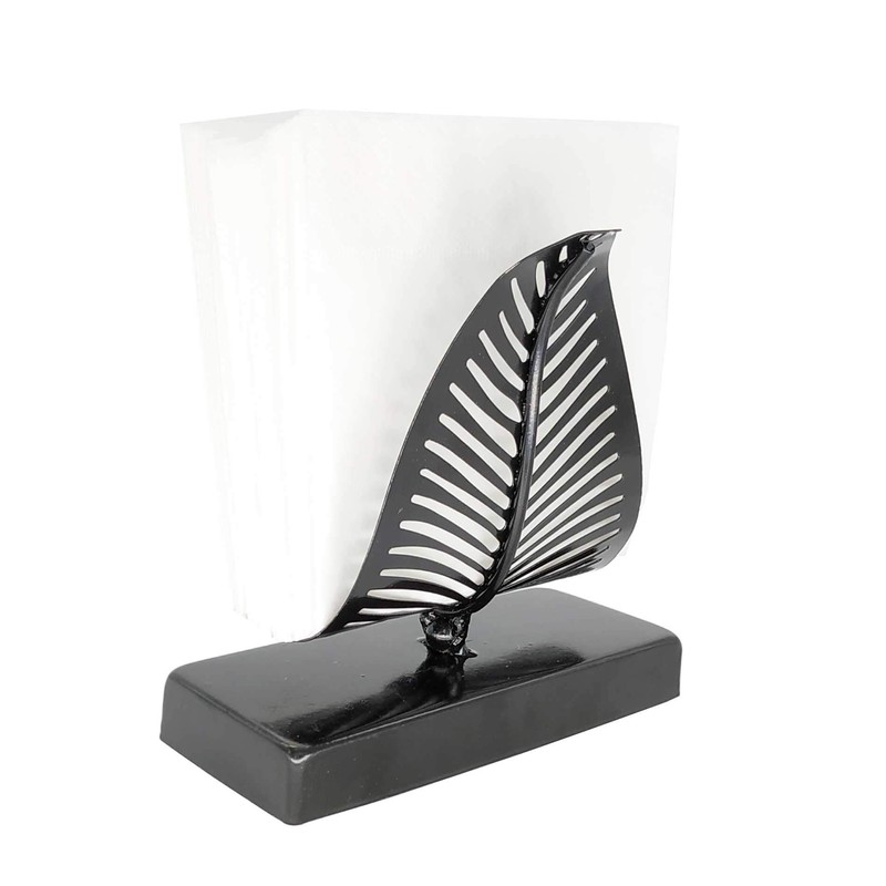 Made of sturdy metal with a matte modern black powder-coat finish, this decorative napkin stand boasts an intricate leaf design, adding a unique element to meal time.
