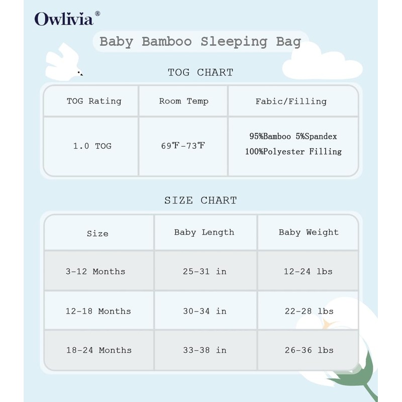 - 2-way zipper: Owllivia sleeping bag featured with 2-way zippers for easy diaper change, zipper flaps are added to avoid irritation.