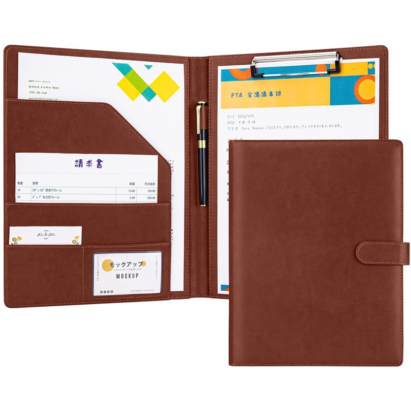 OWLKELA バインダー A4 クリップボード 2つ折り PUレザー クリップファイル 多機能 クリップバインダー 折りたたみ ペンホルダー付き 名刺入れ メモ帳付き ポケット付き プレゼント 贈り物 ギフト オフィス用品 事務用品 (ブラウン)