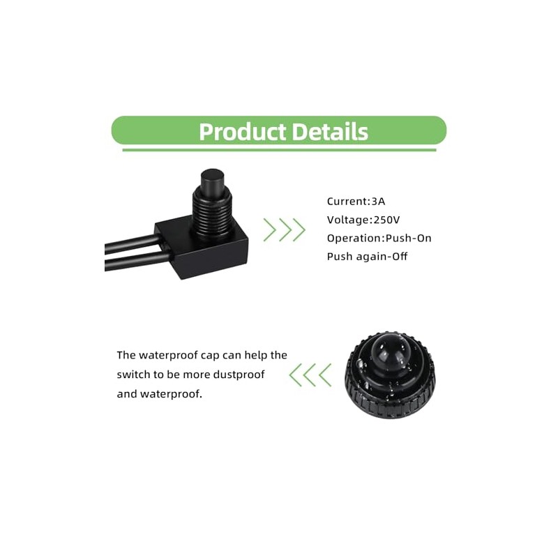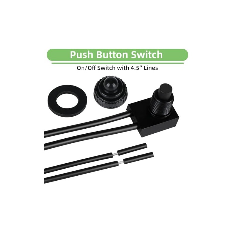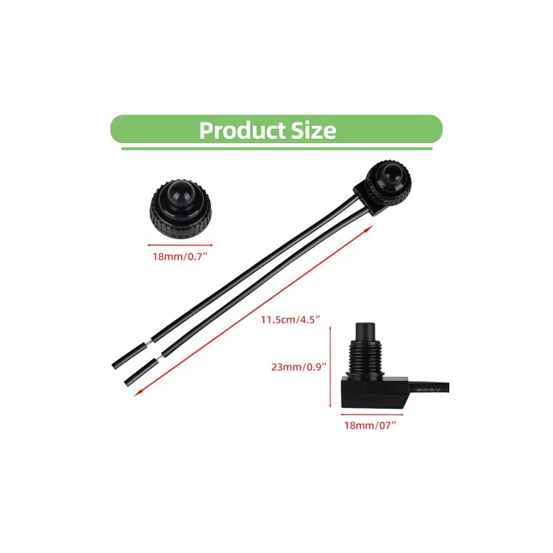 - The KP-107's 17x14mm rectangular base and 10mm mounting holes (0.67"x0.56" and 0.393") make installation easy. The 4.5" cords allow flexible placement. Its push-on, push-off SPST switch is simple to use. switch, with 12mm button and mounting hole diameters and 4" cords, installs quickly. The on-off push button design is easy for all users