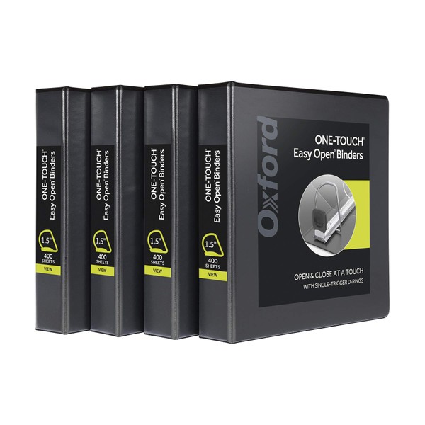 Oxford 3 Ring Binders, 1.5 Inch ONE-Touch Easy Open D Rings, View Binder Covers on 3 Sides, Durable Hinge, Non-Stick, PVC-Free, Black, 4 Pack (79905)