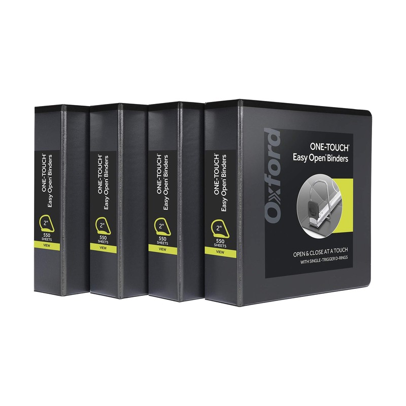 - New Oxford Binder 4-Packs are loaded with features; 2" binders have single trigger D rings that open at a touch, view binder covers on 3 sides, strong XtraLife hinges & archival safe black covers
