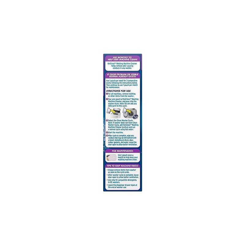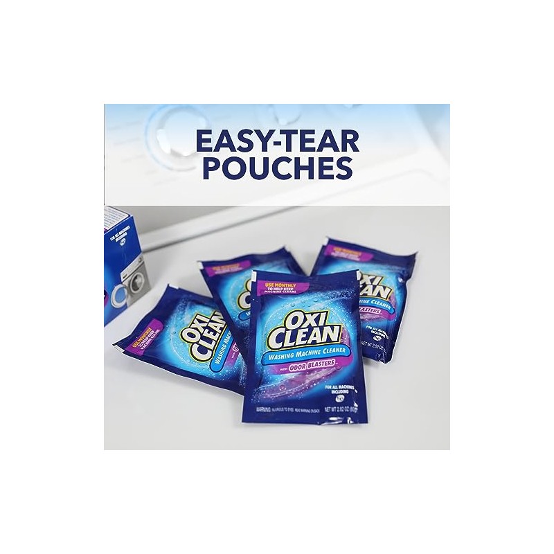 Help remove odor-causing residues in your washing machine with OxiClean Washing Machine Cleaner with Odor Blasters. If you've noticed odors on your clothes, your washing machine might be the cause. These pre-measured pouches combine Odor Blasters with the power of OxiClean to clean your washing machine, remove odors, and help keep it smelling fresh. To use, tear one washer cleaner pouch and toss into an empty washer without clothes or other items. Select the Clean Washer Cycle and run the machine without laundry detergent. If the washer doesn’t have a Clean Washer Cycle, run in a normal hot water cycle. After the cycle is complete, wipe away any remaining residue with a towel and leave the washing machine door open to allow better ventilation. For maintenance, use OxiClean washing machine cleaner once a month to help keep your HE or standard washing machine looking and smelling clean. For existing odors and residues, use once a week for three consecutive weeks, then once a month thereafter for maintenance. Includes one 4-count box of septic-safe OxiClean Washing Machine Cleaner with Odor Blasters. From stain removers and laundry boosters to household cleaners and much more, OxiClean offers a product to fit your needs.