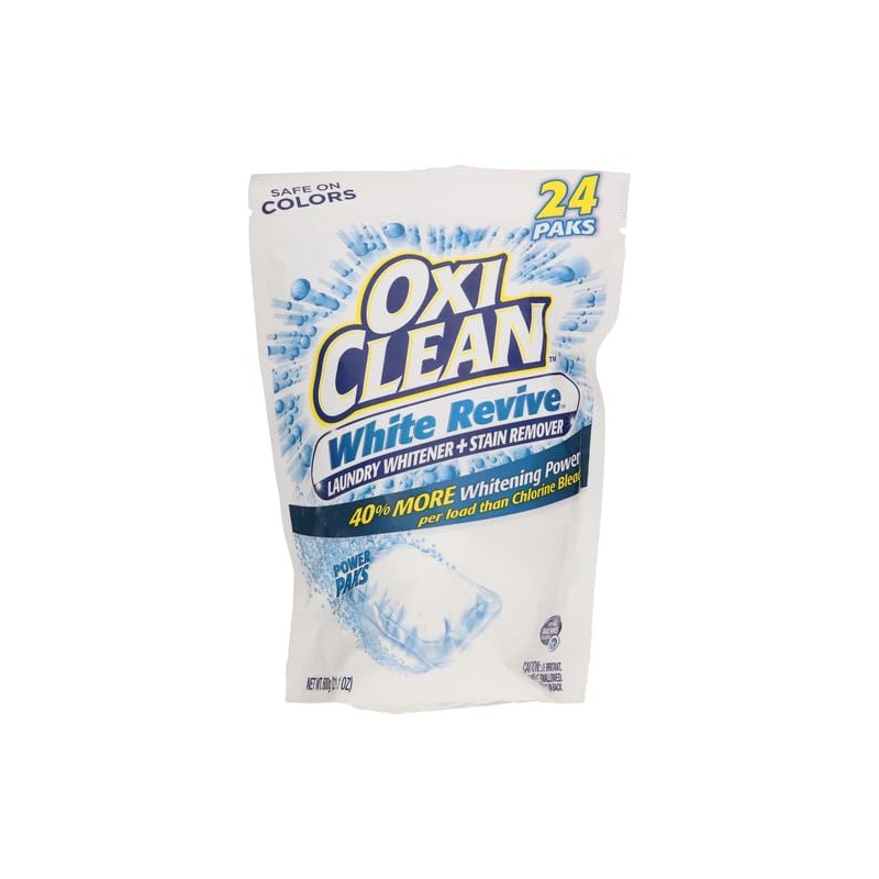 Revive dingy whites and remove tough stains with OxiClean White Revive Laundry Whitener and Stain Remover Power Paks. This laundry detergent booster whitens whites 40 percent better than chlorine bleach per load without the risk of chlorine spills and splatters. When used as directed, this oxygen-based, water-activated, color-safe stain remover for white clothes removes stains, and brightens and revives machine-washable white clothes, canvas shoes, sheets, t-shirts and more, all without the harsh smell of bleach. Ideal for HE and standard washing machines, these clothes whitener laundry paks work with your regular laundry detergent as a chlorine bleach alternative to revive brilliant whites. Power Paks are mess-free and require no measuringjust drop a pak into the drum, add detergent, and then add clothes. This 24 count pouch has enough fabric whitener laundry booster Power Paks for many laundry loads, so you can wear white fearlessly. From stain removers and laundry boosters to household cleaners and much more, OxiClean offers a product to fit your needs.