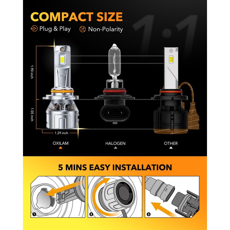 - EASY INSTALLATION: OXILAM 9005 bulbs has a compact size with straightly plug and play. Non-Polarity requirement, no external driver, no huge bulb base. Complete your hassle-free upgrade in under 5 minutes.