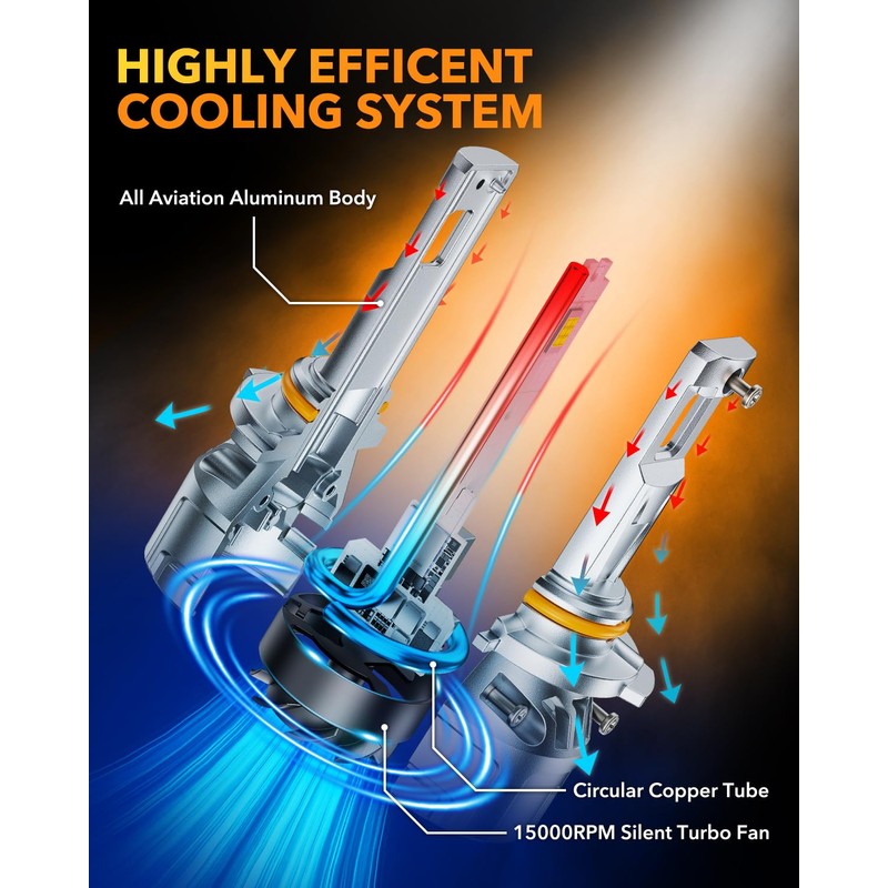 - 60,000HRS LONGER LIFESPAN: OXILAM P2 series uses the latest chips, which consumes less power than halogen bulbs, which means less heat is generated. At the same time, these LEDs have advanced cooling technology: a full aluminum body and an annular copper tube, a 15,000RPM silent cooling fan effectively dissipates heat, and can be illuminated continuously without damage in a short period of time.