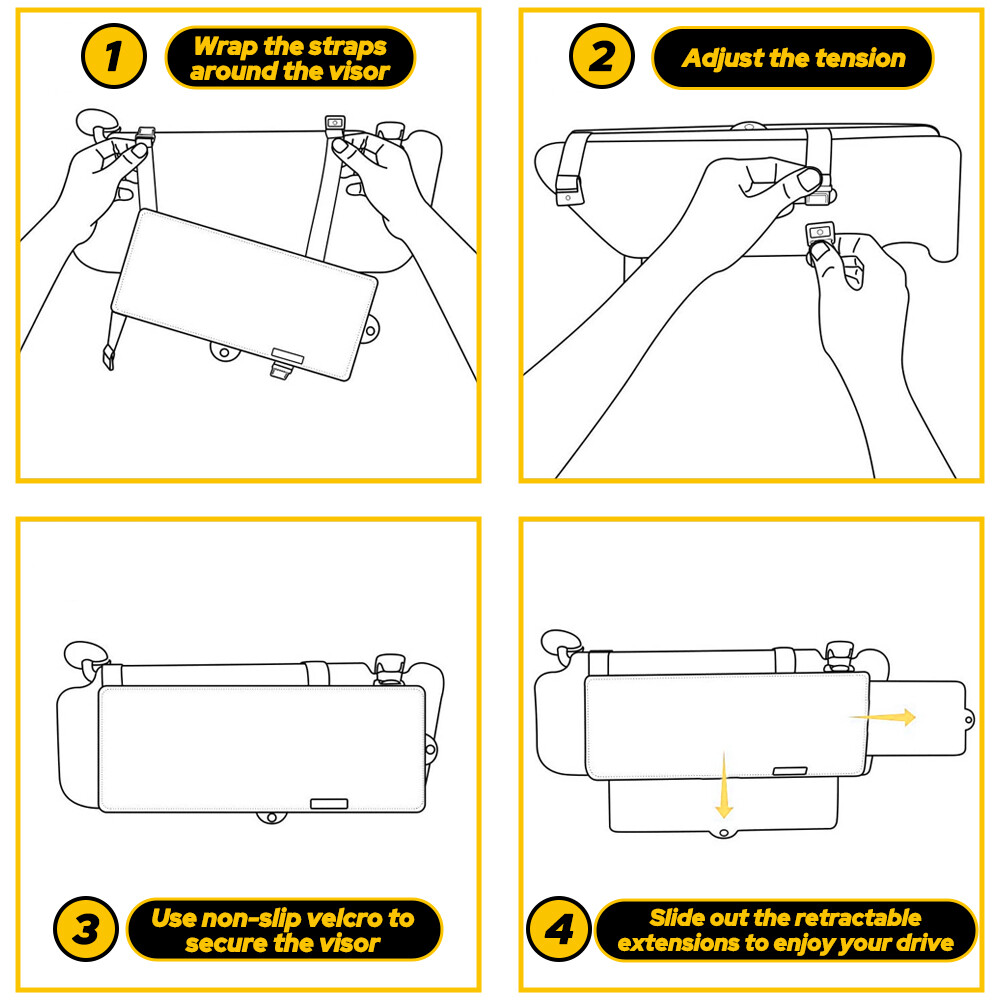 Attach it to the existing visor with elastic bands. Then adjust the two sliders to its optimal placement to block out sunlight.