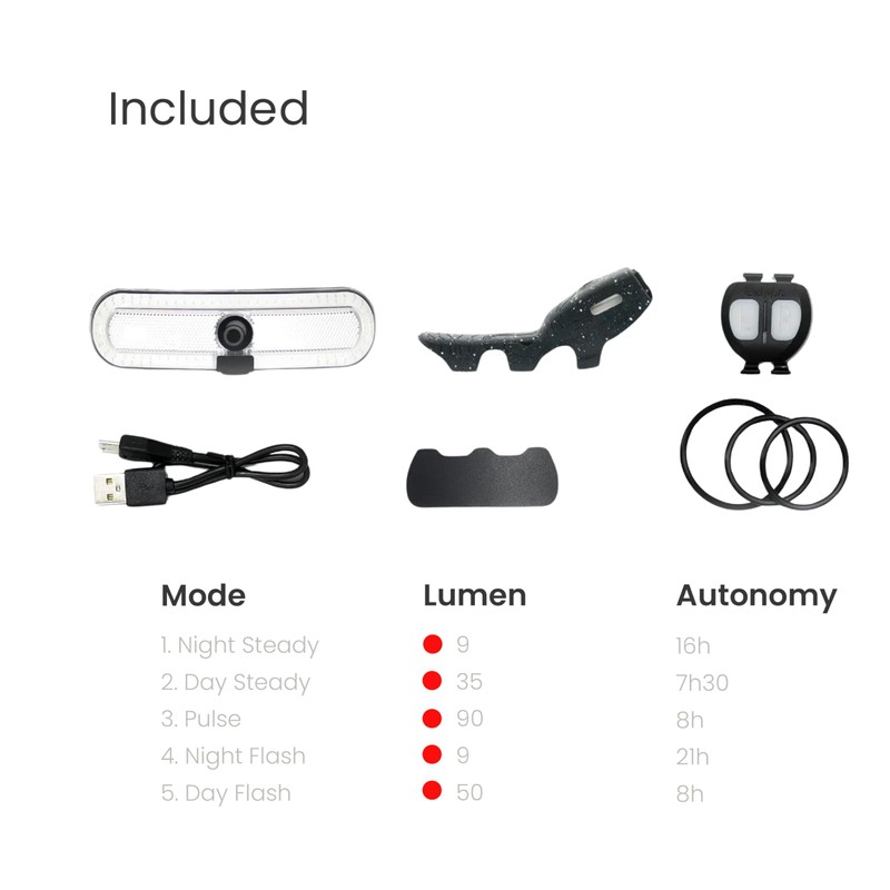 - HIGH VISIBILITY: great autonomy and power thanks to its 220° of diffusion, its maximum power of more than 100 lumens and an autonomy of more than 20h. OxiLum is the ideal lighting to ride safely every day.