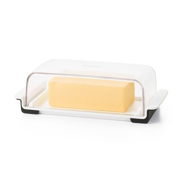 Butter behaves better in the OXO Good Grips Wide Butter Dish. This Butter Dish features stoppers on either side to keep butter in place while cutting, allowing for clean slices without slipping. The soft, comfortable, non-slip grips make it easy to hold the Butter Dish in place, and the measurement markings accommodate European-style wide sticks of butter, 8 oz cream cheese or two 4 oz sticks of butter. The clear lid rests on the Butter Dish without sliding off, allowing for easy transport from kitchen to table. The durable body and lid are both dishwasher safe and BPA free.