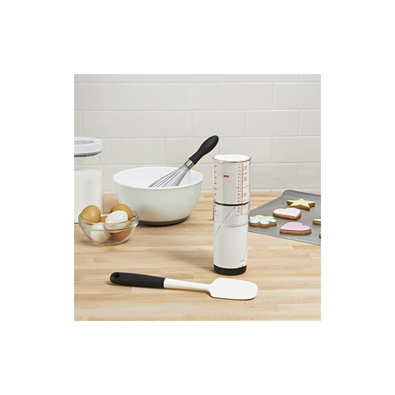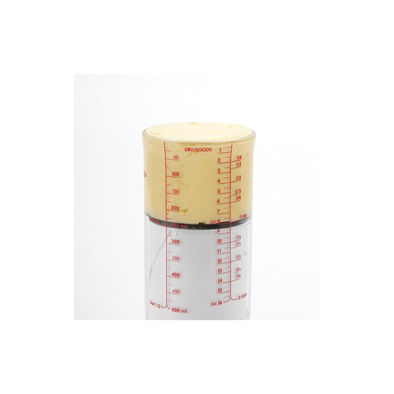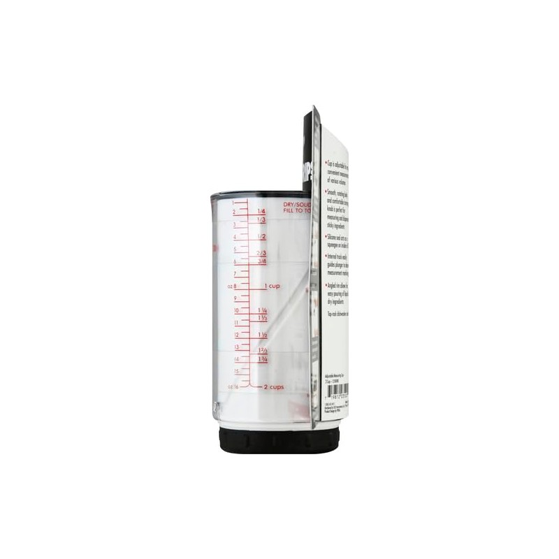 OXO Good Grips Adjustable Measuring Cup:Get yourself out of sticky situations with the OXO Good Grips Adjustable Measuring Cup. An internal track and comfortable turning knob allow the plunger in the body of the Measuring Cup to adjust smoothly to the desired measurement marking. Simply fill the cup with your sticky ingredient and turn the knob to push it right into your mixing bowl. The plunger acts as a squeegee on the inside of the Cup, getting out every last bit of your ingredient. The Cup can also be used for wet and dry ingredients, eliminating the need for multiple sizes of measuring cups and spoons scattered throughout your kitchen. The generous rim makes pouring ingredients easy. It's the Little Things:At OXO, we consistently develop products that address even the tiniest of pet peeves, because we know it's the little things that make the biggest difference. With many cooking and baking aficionados among us, we know all too well the difficulties that come with measuring sticky foods. The twisting track makes sure the Cup won't re-adjust while you're adding ingredients, to ensure you always have the most accurate measurement. Features & Benefits: Adjustable: Cup twists for easy, convenient measurement of various volumes Dispenses sticky ingredients: Smooth, rotating body and comfortable turning knob is perfect for measuring and dispensing peanut butter, honey and other sticky products Accuracy: Internal track easily guides plunger to desired measurement marking Measurement: The Cup has easy-to-read measurement markings for liquid or dry ingredients, in ounces, milliliters and cups Plunger: Silicone disk acts as a squeegee inside of Cup Easy-pour: Generous rim makes pouring wet or dry ingredients easy Capacity: Measuring Cup is available in 2 cup, 1 cup and 1/8 cup sizes Cleaning: Top-rack dishwasher safe BPA FreeGood Tip:With this Cup, you don't have to dirty multiple measuring cups for one recipe! Usable for dry, solid, liquid and sticky ingredients, this product covers all your measuring needs. You won't even need to use a spatula to pull out left-over residue, as the design pushes out even the stickiest of ingredients with no waste.OXO is dedicated to providing innovative consumer products that make everyday living easier. How do we do it?We study people C lefties and righties, male and female, young and old C interacting with products and identify ways to make them better. Our question everything process and relentless attention to detail uncover the best solutions for slicing, peeling, whisking, baking, stirring, washing, scrubbing, dusting, storing and organizing.