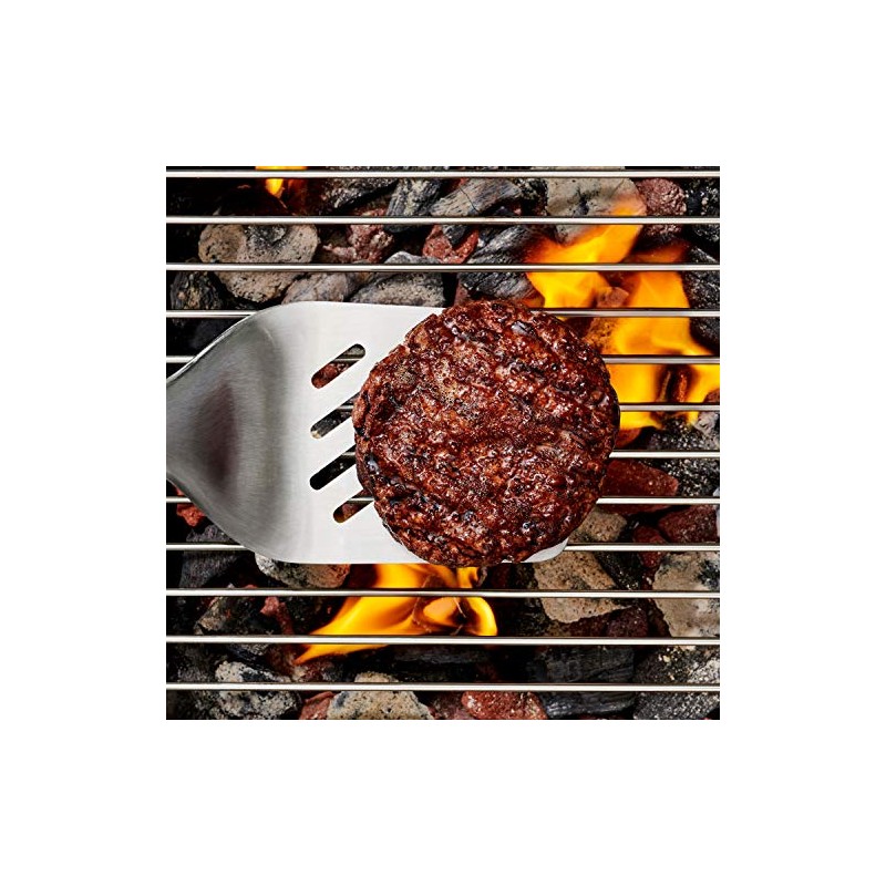 - Durable stainless steel turner is perfect for flipping burgers on the grill