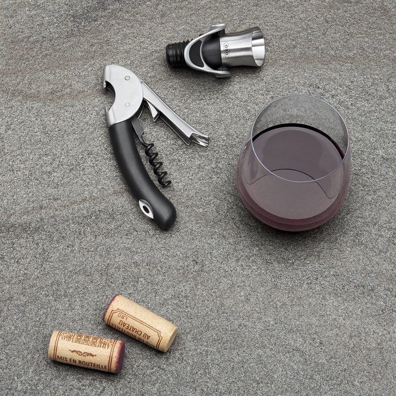 Whether you're a waiter or just like to be prepared, the OXO Steel Double Lever Waiter's Corkscrew is the perfect tool for opening any type of bottle. This Corkscrew opens all cork-topped bottles with ease - the non-stick screw glides smoothly into the cork, then the second lever retracts for easy, no- fuss cork removal. A handy foil cutter folds right out of the handle, always at the ready. A bottle cutter is integrated in the comfortable, non-slip handle, making pop-top bottles as easy to open as corked ones, all in one handy tool. The durable stainless steel provides an elegant feel and the compact size makes it perfect for picnics or travel.