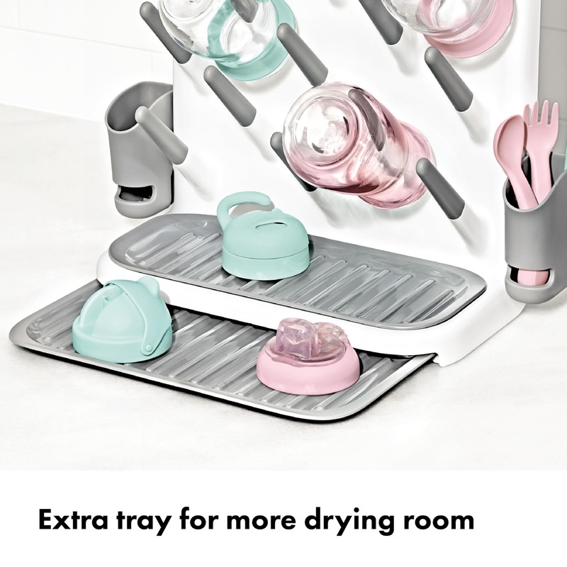 - A Place for All the Baby Stuff: Dry nipples and teethers in the top compartment, dry bottles and cups on the 13 angled pegs, dry utensils in the two side cups and dry lids and bottle rings on the two bottom trays with elevated ridges to catch all the drips.