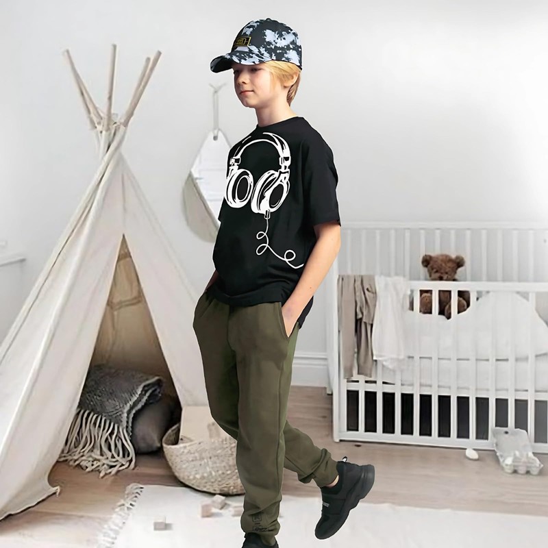 - VERSATILE COLOR SCHEME: The boys summer pants and top set includes a classic black short-sleeved top paired with vibrant green pants. The timeless black top, featuring a trendy headphone print, offers a modern and simple design