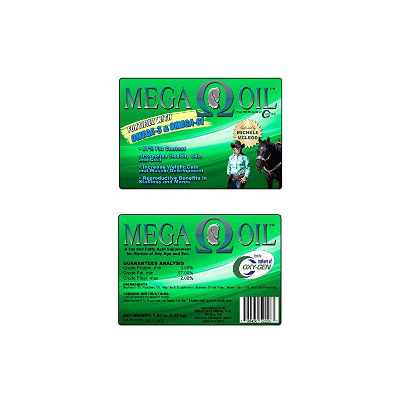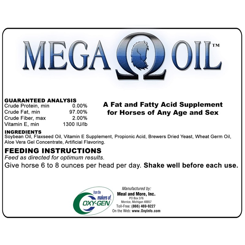 Oxy-Gen Equine97% Fat ContentPromotes Healthy Skin and CoatIncrease Weight Gain and Muscle Development Reproductive Benefits in Stallions and MaresAlso available in 2.5 gallon1 gallon0091710Mega Oil horse supplement is a fat and fatty acid supplement. It promotes healthy skin and coat, as well as helps to increase weight gain and muscle development.Shake well before each use. Give horse 6 to 8 ounces per day.