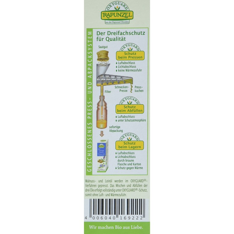 - The walnut and linseed oil are gently pressed in the OXYGUARD process. The entire processing from opening the bowl to pressing and filling takes place without light, air and heat
