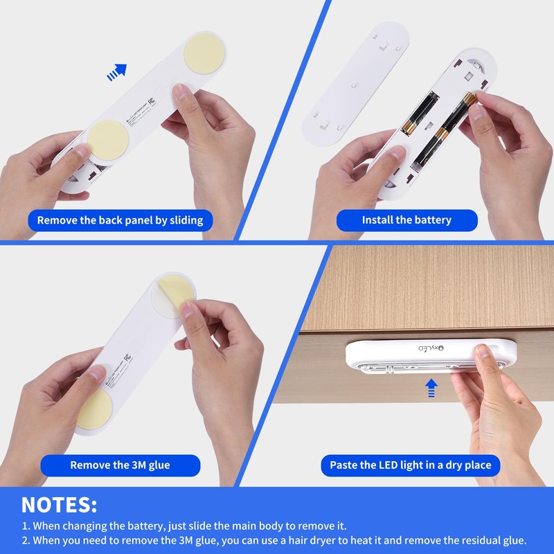 - SIMPLE INSTALLATION: This cabinet light comes with a detachable back with 2 3M sticky pads. After installing 3PCS AAA alkaline batteries (Not Included). (Note: 1. 3M sticker may lose its stickiness if you change it from one place to another. 2. Use new batteries only. Never mix old and new batteries)