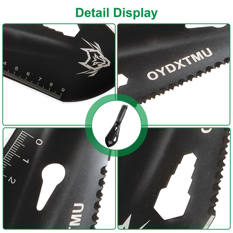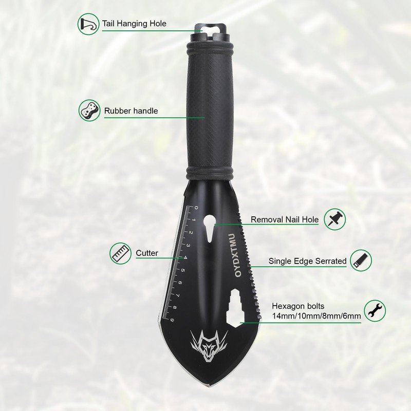 - THE ULTIMATE MULTIFUNCTIONAL TOOL FOR OUTDOORS: This 9-in-1 multifunctional backpacking shovel is designed to meet all your outdoor needs. In addition to a sharp shovel head, it features a rubberized handle, a cutter, scale, nylon lanyard, nail puller, single-edged serration, and 14mm/10mm/8mm/6mm hex bolts.
