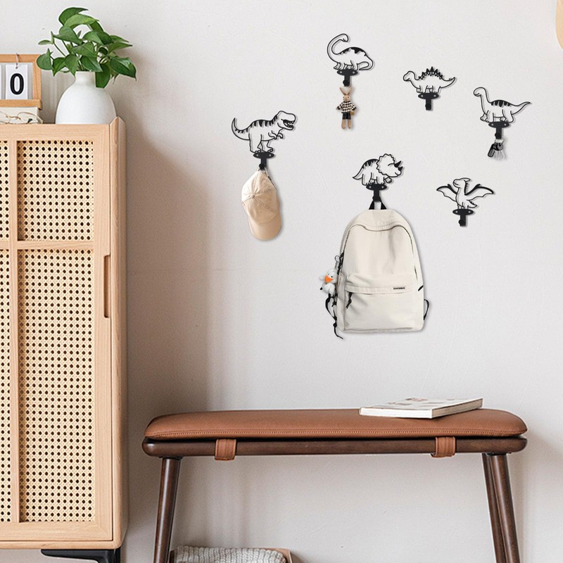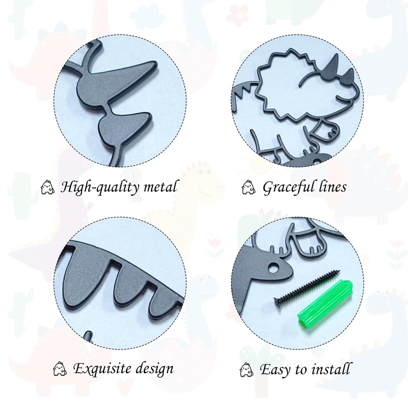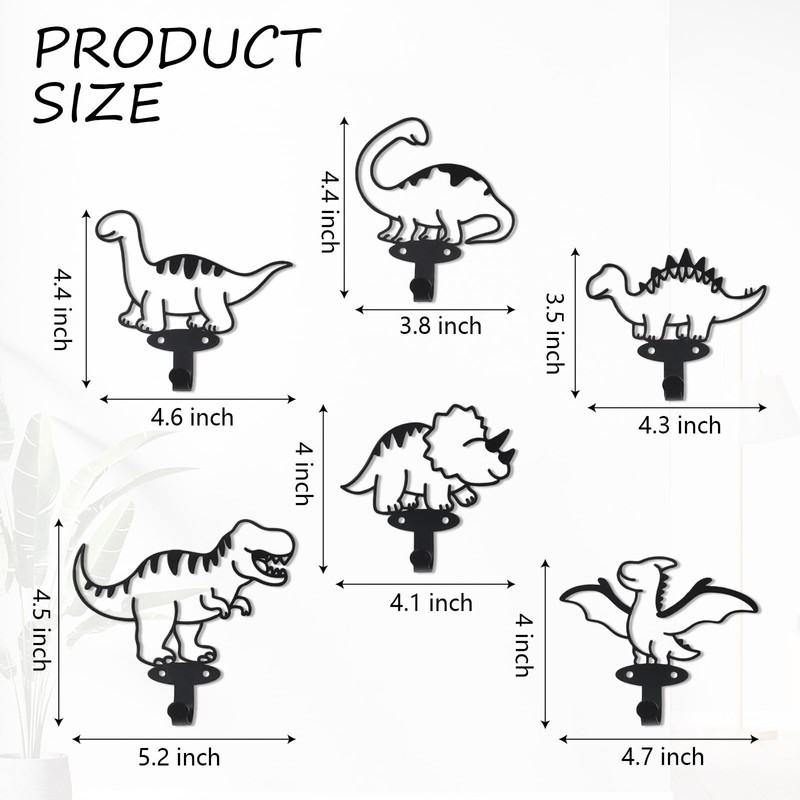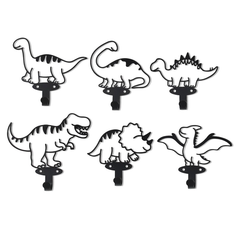 - This set includes 6 black metal cartoon dinosaur silhouette hangers.