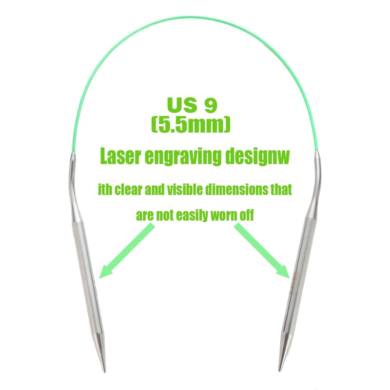 - Including size 9. Each needle is 4.1 inches long. The wire rope is 7.8 inches long. The total length is 16 inches (approximately 40 cm), which is very suitable for small knitting projects such as woolen hats and sleeves.