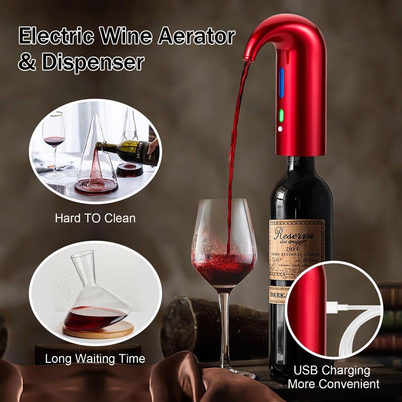 - 【Electric Wine Aerator & Dispenser】This product is hundreds of times the natural oxidation effect of traditional decanter through the high pressure oxygenation of red wine, red light, magnetic triple. Built-in lithium battery, the product uses USB cable charging