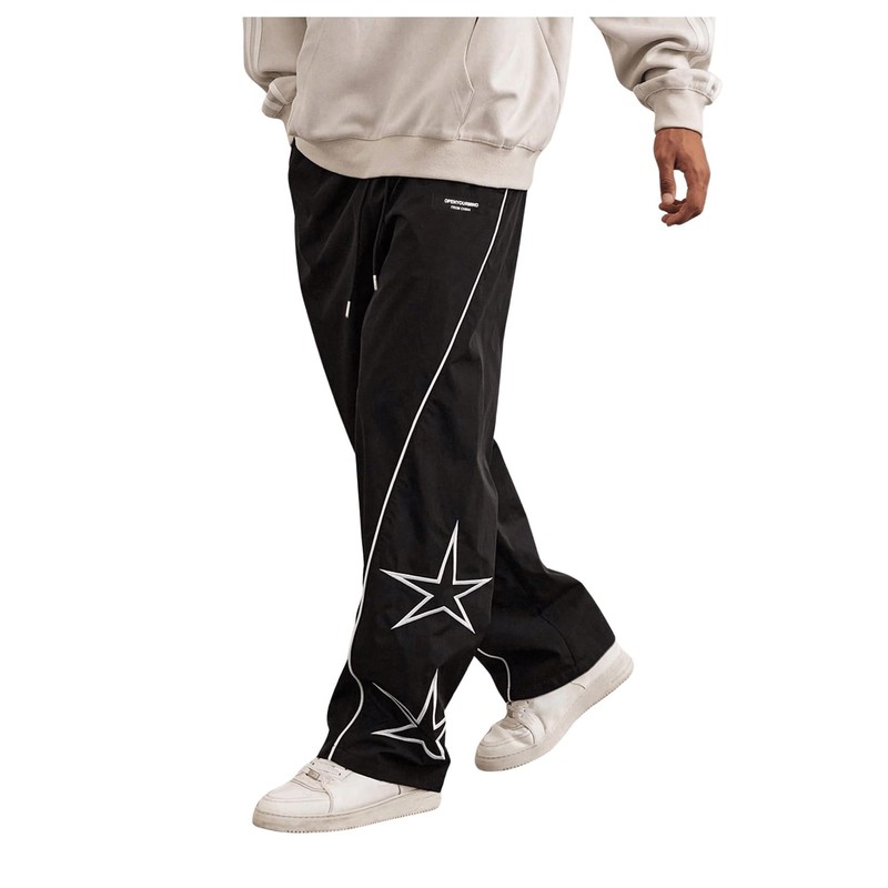 - Design: Star print, letter patched, drawstring waist, elastic waist, straight leg, loose fit, pocket