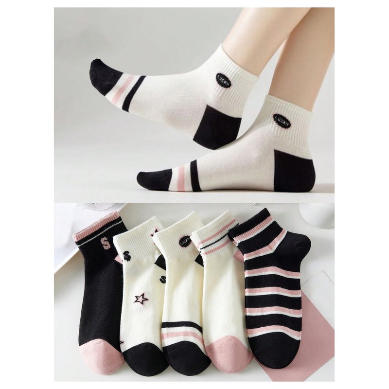 OYOANGLE Women's 5 Pairs Striped Letter Print Ankle Socks Color Block Knit Soft Lightweight Casual Crew Socks Multicolor 40-43