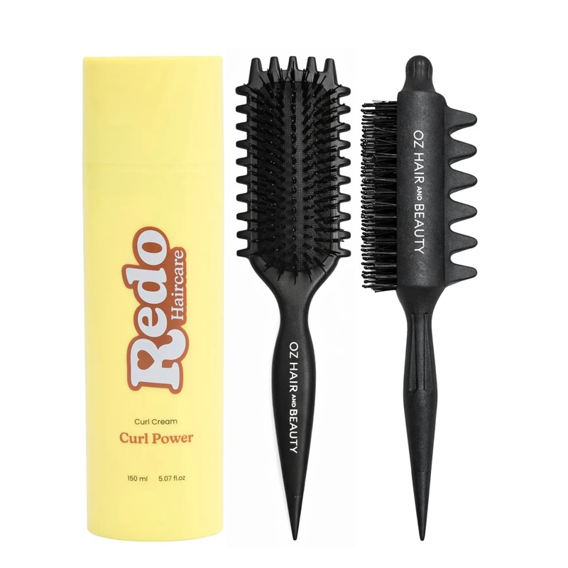 The Curl Boss Trio – Curl Defining Brushes & Curl Cream Set - Black is your ultimate solution for perfectly defined curls. This comprehensive set includes two expertly designed curl defining brushes and a nourishing curl cream, all crafted to enhance and maintain your natural curls. The Oz Essentials Fine Curls Defining Brush is perfect for detangling and defining fine curls, while the Oz Essentials Curl Lovers Defining Brush is ideal for thicker, more voluminous curls. The Redo Haircare Curl Power Curl Cream provides essential moisture and hold, ensuring your curls stay bouncy and frizz-free all day long. What is included in Curl Boss Trio – Curl Defining Brushes & Curl Cream Set - Black? • Oz Essentials Fine Curls Defining Brush - Black • Oz Essentials Curl Lovers Defining Brush - Black • Redo Haircare Curl Power Curl Cream 150ml What are the features and benefits of Curl Boss Trio – Curl Defining Brushes & Curl Cream Set - Black? Oz Essentials Fine Curls Defining Brush: This brush is designed to gently detangle and define fine curls without causing breakage or frizz. Its flexible bristles glide through hair effortlessly, making it easy to achieve smooth, defined curls. Oz Essentials Curl Lovers Defining Brush: Perfect for thicker curls, this brush helps to shape and define curls while reducing frizz. Its sturdy bristles provide the right amount of tension to enhance curl formation and add volume. Redo Haircare Curl Power Curl Cream: This curl cream is formulated to provide long-lasting moisture and hold, keeping curls soft, bouncy, and frizz-free. Enriched with nourishing ingredients, it enhances curl definition and adds shine. Who is Curl Boss Trio – Curl Defining Brushes & Curl Cream Set - Black for? This set is perfect for anyone looking to enhance and maintain their natural curls with ease and precision.