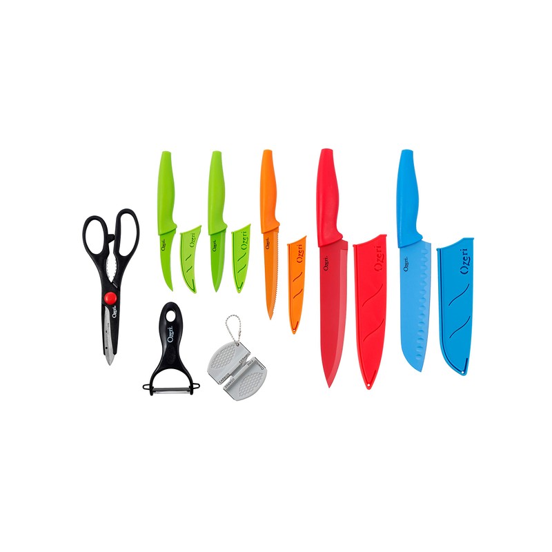 - Features 5 stainless-steel knives with 4 food-safe non-stick colors - 8” Red Chef Knife, 7” Blue Santoku Knife, 5” Orange Utility Knife, 3.5” Green Paring Knife & 3.5” Green Beak Knife.