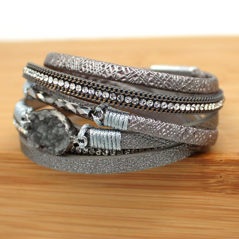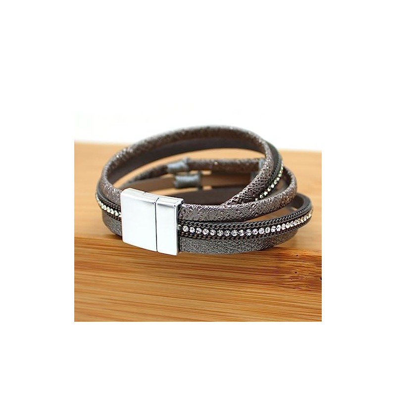 P Ammy Fashion® Bohemian Leather Wrap Bracelets Crystal Cuff Stackable Boho Bangles Double-Wrap with Magnetic Clasp (Double Wrap-Grey)