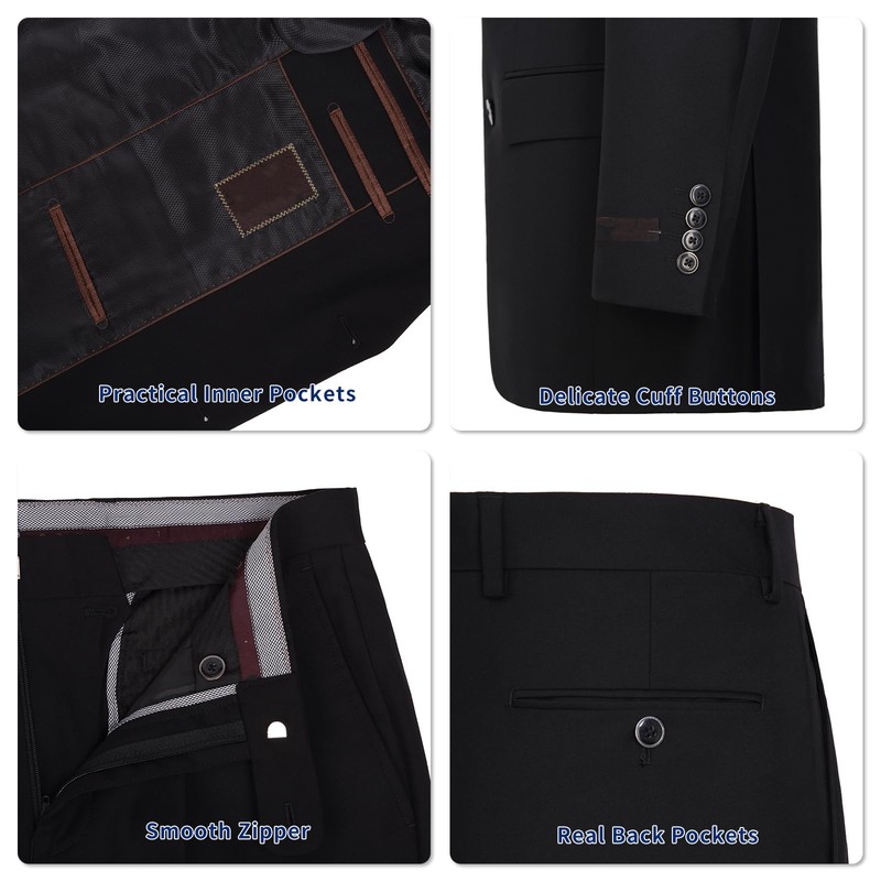 - Blazer: The two-button single-breasted jacket features breathable lining, notch lapel and dual side vent jacket.