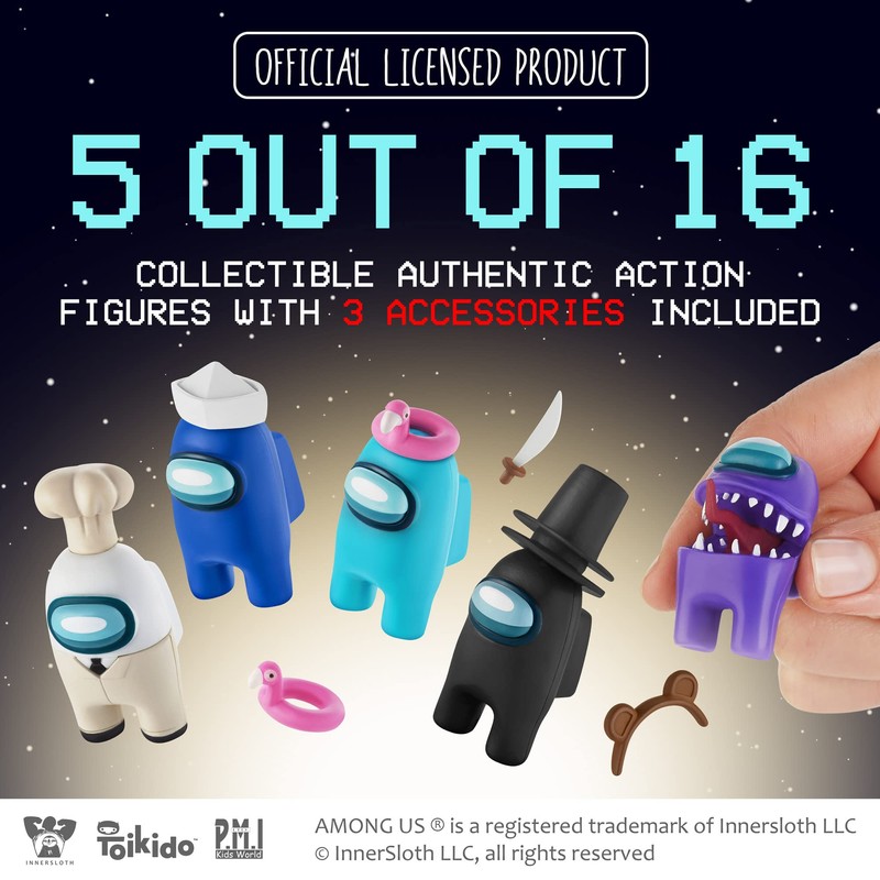 - ゲーム開発者によってライセンスを受けたアメリカのおもちゃの中の本物です。 このミニトイの製造元であるP.M.I.は、Among Usを創設した会社であるInnerSlothによってライセンスされています。 この子供用おもちゃは、ゲームのオリジナルスタイルに似合います。 このAmong Usパーティーグッズは、パックに含まれている3つのアクセサリーのように、プロデューサーの細部へのこだわりを示しています。 お子様がゲームに興味を掻き立てたり、すでにファンならご褒美ください。