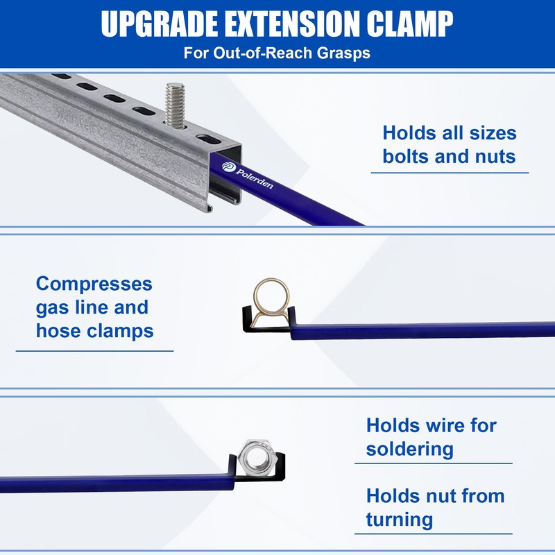- 【Upgrade Extension Clamp】 For Out-of-Reach Grasp Holds all sizes bolts and nuts Compresses gas line and hose clamps. Holds wire for soldering. Holds nut from turning.