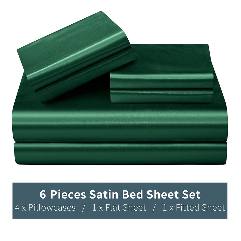 P Pothuiny 6 Pieces King Satin Sheets Luxury Silky Blackish Green Satin Beddi...