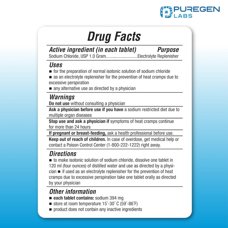 - ? Fast Acting: Puregen Labs Sodium Chloride (Normal Salt) tablets work quickly to combat or prevent sodium depletion.