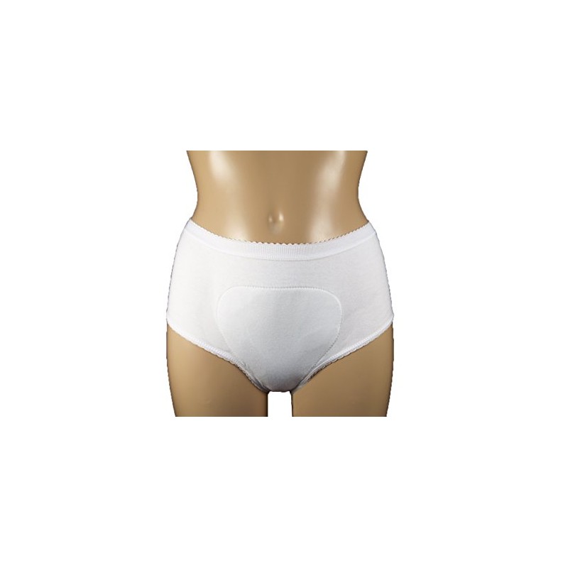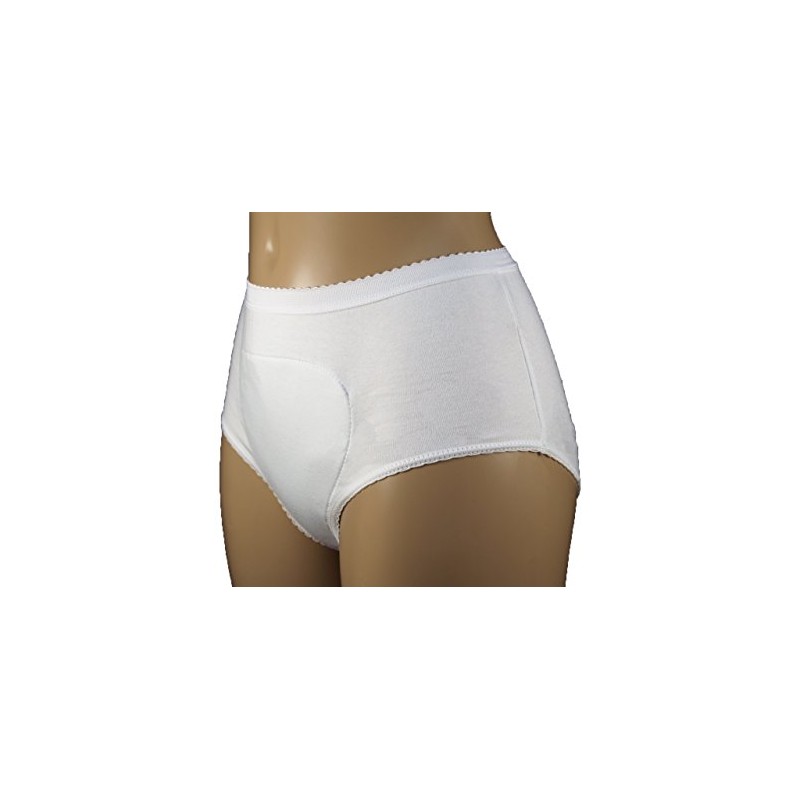 Ladies full super brief for continence care with built-in absorbent pad and waterproof back. This 100% cotton re-usable incontinence brief holds approx. 260mls and can be washed up to 250 times before being replaced. Available in sizes: X-Small (28-30" - 71-76cm), Small (30-32" - 76-81cm), Medium (33-36" - 84-91cm), Large (37-40" - 94-102cm), X-Large (41-44" - 104-112cm) and XX-Large (45-48" - 114-122cm). Products can be washed at 40 degrees using a mild detergent without built-in fabric softeners. Do not use bleach or liquid fabric softeners. Do not tumble dry. Products with built-in pads will take longer to dry than conventional underwear. For hygiene reasons, incontinence products are non-returnable.