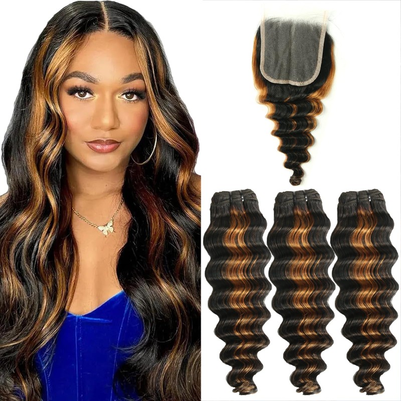 - Loose Deep Bundles with Closure Human Hair Color: P1B/30 Ombre Highlight Loose Deep Wave Human Hair, Two Tone Black Mixed with Brown Ombre 3Bundles with Closure Human Hair, Double Weft, High Elasticity, Can be Straightened, Curled, and Dyed to Reddish Brown, Burgundy, Ginger and so on