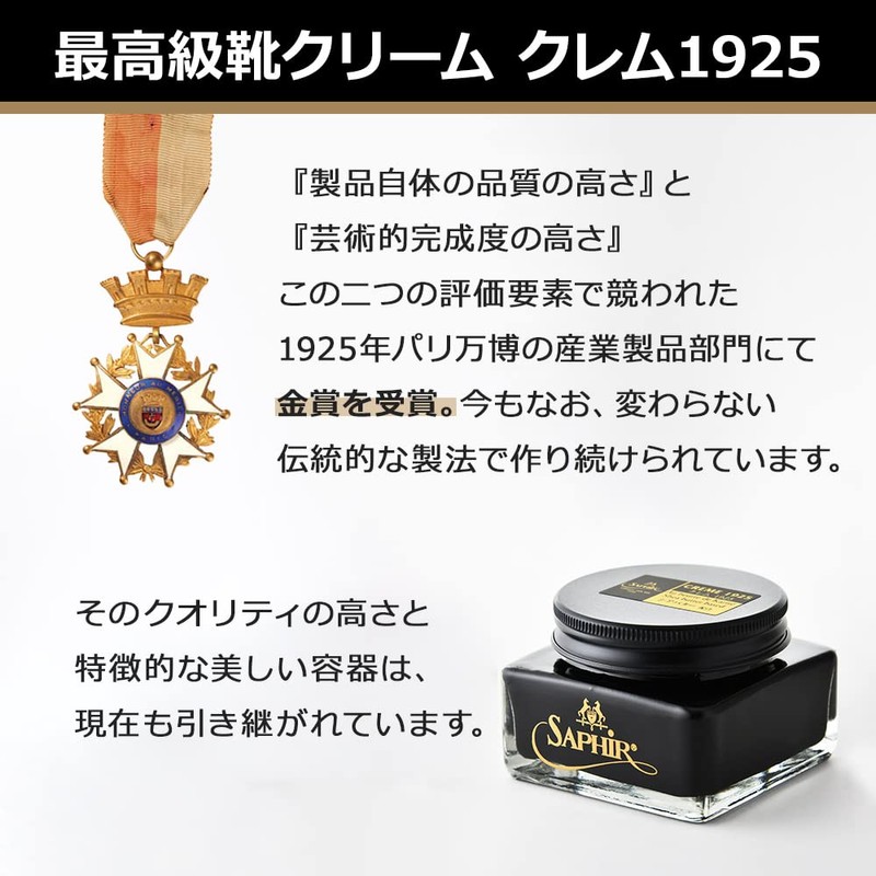 - サフィールノワール(SaphirNoir)は、選りすぐられた天然原料を使用した伝統的なレシピと、素材の良さを最大限に引き出す仕上がりの美しさによって、長年にわたり欧州を代表するレザー製品ブランドや靴職人などに愛され続けています。