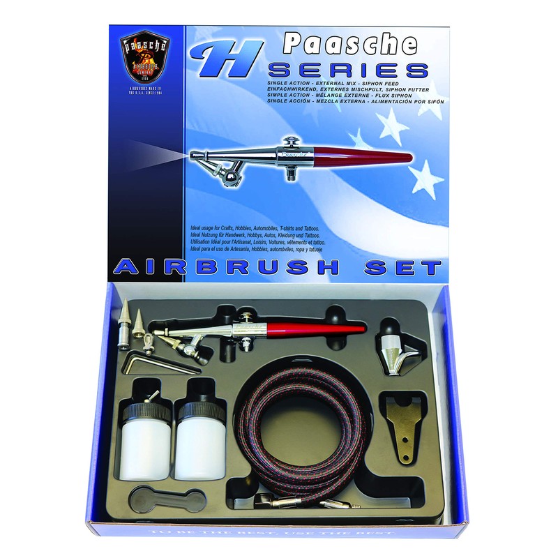 • Airbrush Set: H-SET includes H#3 airbrush, size 1 & 5 spray heads, 1/4 oz metal cup, 1 oz bottle assembly, 1 oz storage bottle, hanger, wrench, 6-foot braided air hose, lessons booklet and manual