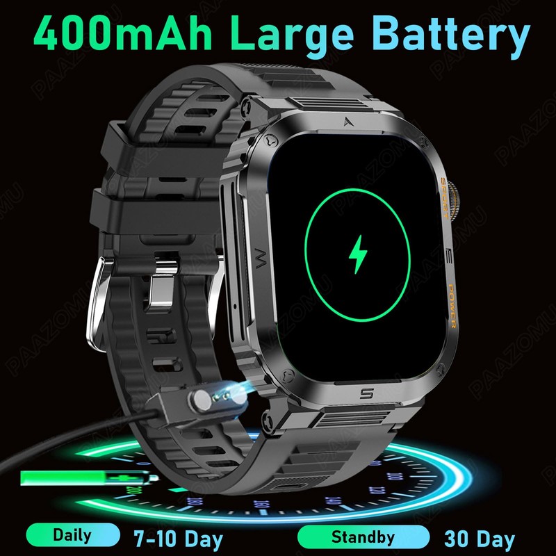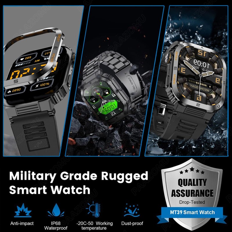 ⌚【MILITARY-GRADE CERTIFIED & ALL-METAL FRAME】The military smartwatch has been subjected to 15 of the most rigorous durability tests to simulate harsh conditions such as deserts, rainforests, and Arctic weather. This proves that only a timepiece engineered tough enough for any environment can be smart enough for accessibility. With IP67 waterproofing, it can handle splashes, sweat, and more, such as washing your hands or during light rain (not suitable for swimming or prolonged submersion). ⌚【BLUETOOTH CALLS & MESSAGES NOTIFICATIONS】Simply connect via the app to make Bluetooth calls and listen to music from the smartwatch. Answer calls and receive vibration alerts for messages and app updates - all from your wrist, freeing you from the need to constantly check your phone when driving, exercising, or doing activities that make holding your phone difficult. The tactical smart watch keeps you informed without causing distractions, so you can focus fully on what you're doing. ⌚【100+ SPORTS MODES & SUPER LONG BATTERY LIFE】Featuring 104 integrated sports modes for any activity - ranging from walking to running, cycling, climbing, yoga, and beyond - this fitness tracker watch accurately and effortlessly tracks daily data like activities, distance, and calories for any purpose. The generous 360mAh battery fully charges in just 2 hours and then lasts up to 10 days per charge for continuous usage, extending to 30 days of standby mode. ⌚【AROUND-THE-CLOCK HEALTH TRACKING】This advanced smartwatch features built-in optical sensors that continuously monitor heart rate, blood oxygen, and blood pressure - albeit an estimate - round the clock. Though not medical diagnostics, the persistent physiological monitoring facilitates helpful health tracking. The sleep tracker continuously monitors your sleep stages, quality, and duration to help you make wise decisions . With 24/7 tracking, you gain insights to sculpt a healthier lifestyle. ⌚【ULTRAHIGH RESOLUTION & CUSTOMIZE YOUR DISTINCT STYLE】The smartwatch empowers you to effortlessly personalize its watch face. Its 2.01" HD display with high 320*386 resolution provides unparalleled visibility even outdoors. It comes with a choice of a metal watch band or a silicone watch band, allowing you to select the style that suits you best. Through the app, gain access to over 200 customizable watch faces and create personalized ones using images, showcasing your unique persona and style.